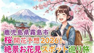2026年、鹿児島県霧島市の桜が最も美しく輝く瞬間へ。霧島神宮のしだれ桜や丸岡公園の絶景、飛行機と桜が共演する穴場まで徹底解説。最新の開花予想に基づいた一泊二日の温泉旅行モデルコースや、地元グルメ情報も満載です。神話の里・霧島で、心に刻まれる春の旅を計画しませんか?
