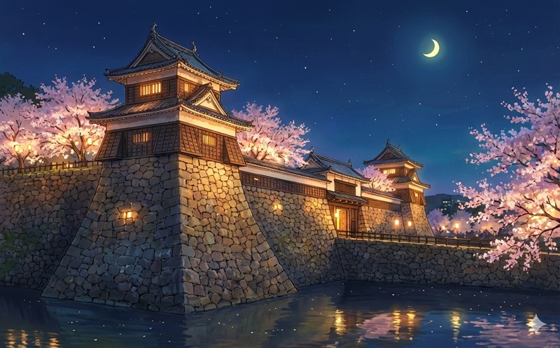 昼間の陽光に輝く桜並木から、夜の静寂に浮かび上がる幻想的な城壁まで。