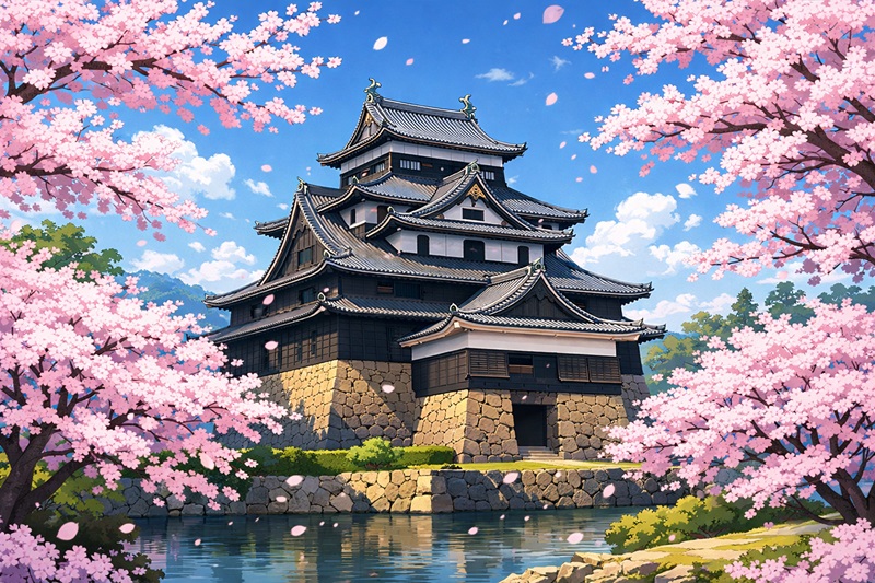 春の光に包まれ、国宝・松江城の黒壁に淡い桜色が映える瞬間。
