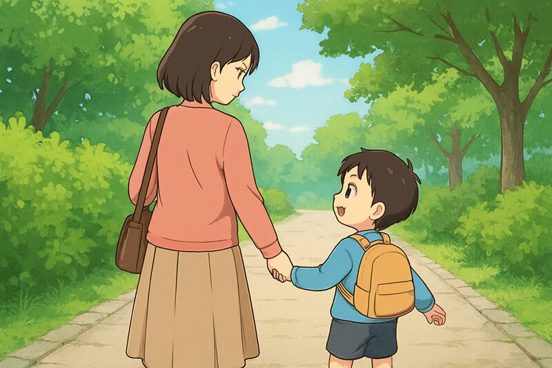子どもが母親の後を追って駅まで着いていく